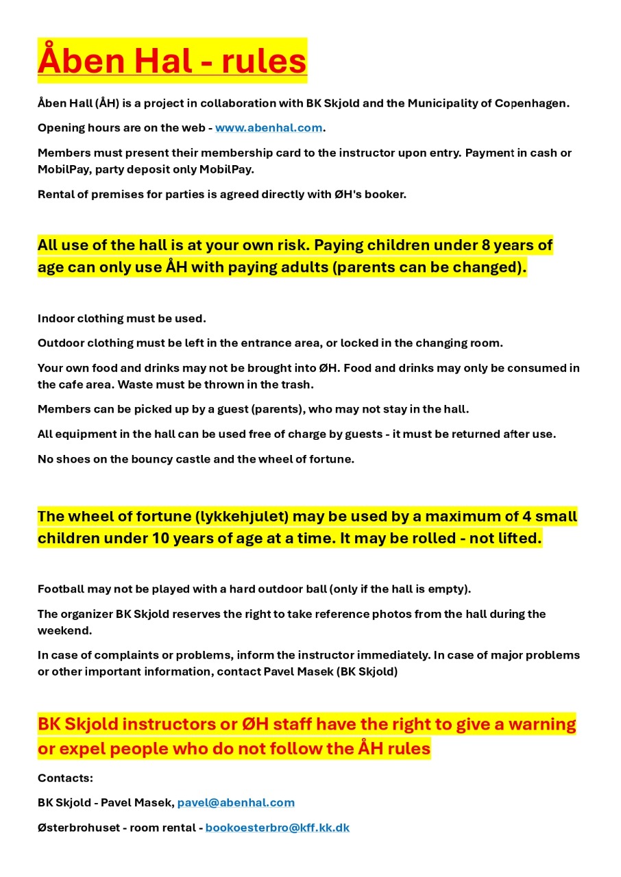Birthday parties and groups of more than 10 people: Without prior agreement and payment of a deposit, we cannot guarantee that there is space in the hall. First contact Pavel by e-mail - pavel@abenhal.com, and ask if there is space in the hall. Please note that BK Skjold is only responsible for the Open Hall event in the hall itself at Østerbrohuset.